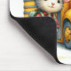 Eine in Jeans gekleidete niedliche Maus und ein rotes Shirt stehen sicher vor einem gelben Schulbus mit einem grünen Rucksack