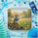 Eine charmante Maus in einer Jeansjacke sitzt auf einem Baumstamm in einer lebendigen Wiese, pustet auf einen Löwenzahn und beobachtet, wie seine Samen im Sonnenlicht davonschweben.