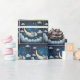 Niedliche graue Maus, die in einer Wolke mit Halbmond am dunkelblauen Himmel schläft.