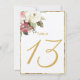 Die Einfachheit dieser eleganten Sitzzuweisungskarte ist wunderschön. Das Design zeichnet sich durch eine dünne und minimalistisch ungleichmäßige goldene Kante mit goldener Typografie für anpassbare Tisch, Tischnummer und Liste der Gäste, die jedem Tisch zugeordnet sind. In der links Ecke oben befindet sich ein wunderschönes Bouquet in Lila-Rosa und Weiß.