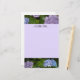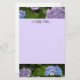 Ein hübsches Design mit Kopf und Fußzeile mit lila und blauen Hydrangea Blüten umgeben von grünem Blattwerk. Ein weicher lila Hintergrund und eine Nachricht, die "Ein wenig hallo.." sagt.