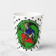 Diese Papiertassen zeigen HoMeArt's ursprüngliche Variante eines Maxfield Parrish Elf aus der Zeit vor dem Ersten Weltkrieg mit weißen und schwarzen Polka-Punkten-Strumpfhosen gegen kelly grüne, runde Medaille, die über einem schwarzen Polka-Dot-Hintergrund schwebt. Der Gruß "Frohe Weihnachten" wird immer wieder um die Medaille umkreist.