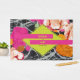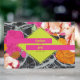 Neongelbe Diamantform über rosa Orange und pfirsichfarbene, moderne Blumen mit dunklem Marmordesign. Namen in Neongelb über heißen rosa Balken. Der übrige Text ist schwarz.