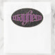 Das Wort "Mayhem" als Ambigramm auf einem verzierten Oval. Ambigrame sind Wörter, die auf den Kopf gestellt werden können und immer noch gleich lesen.