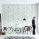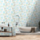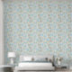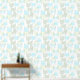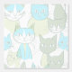 This pattern is special because it utilizes a stylishly muted, cool-toned color palette of blue, sage, and pale yellow to update a whimsical mid-century modern (MCM) cat motif. The abstract graphic style and repeating seamless layout make it a versatile design for textiles, children's products, or adding a touch of sophisticated retro charm to any space.