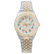 Die Armbanduhr dieser Männer hat ein modernes Design aus konzentrischen Kreisen in Gold, Orange und Türkis auf weißem Hintergrund.