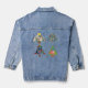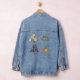 Diese Jeans aus Denim hat ein zeitgemäßes Design von Weihnachtsbäumen in verschiedenen Stilen. Eine hat ein Gitter mit Rechtecken mit innen liegenden Sternexplosionen. Ein anderer hat abgerundete Rechtecke mit kleineren Rechtecken im Inneren. Ein Drittel hat gekrümmte Linien mit Sternen. Der letzte Baum ist ein Dreieck mit anderen kleineren Dreiecken im Inneren