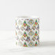 Diese Tasse hat ein modernes Design von Weihnachtsbäumen in verschiedenen Stilen. Eine hat ein Gitter mit Rechtecken mit innen liegenden Sternexplosionen. Ein anderer hat abgerundete Rechtecke mit kleineren Rechtecken im Inneren. Ein Drittel hat gekrümmte Linien mit Sternen. Der letzte Baum ist ein Dreieck mit anderen kleineren Dreiecken im Inneren