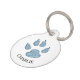 Parties scintillant bleue empreinte de patte avec le nom du chien à l'avant avec arrière - plan blanc, à l'arrière arrière - plan d'alerte rouge avec le texte blanc qui dit OH Snap! Je suis perdu - Appelle ma maman, elle pleure moche. L'arrière - plan rouge attire l'attention sur l'étiquette de quelqu'un qui trouve le chien pour s'assurer de voir l'alerte.