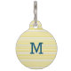 Deux étiquettes d'identification de chien latéral avec un petit rayures jaune arrière - plan à l'avant et un monogramme en police sans serif. Le dos contient le nom du chien et le numéro de téléphone du propriétaire avec le même arrière - plan.