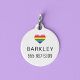 Célébrez et montrez votre soutien à la communauté LGBTQ avec cette chaîne de frappe à coeur rayé arc-en-ciel de 8 couleurs avec un texte moderne noir personnalisé qui peut être personnalisé avec le nom de votre chien ou chat et votre numéro de téléphone. Ce design à deux côtés comprend un arrière - plan blanc propre.