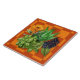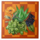 Ceramic kitchen wall tile with medicinal herbs design. Aloe vera, elderberries, basil and yellow flowering calendula are featured over a rust and orange, blocks background. Use as an accent mixed with other tiles for a backsplash or other wall area.