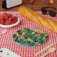 Teller mit William Morris Tapestry Verdure with Deer and Shields (1891-1894). Eine grüne Hirschlandschaft, die aus einem Wasserbecken trinkt und von Blätter von Bäumen in einem grünen Wald gegessen wird. Über ihnen hängen die Schilde der Ritter des Runden Tisches. Ein großartiges Geschenk für Arthuriana-Liebhaber und Viktorianische Kunstsammler.