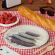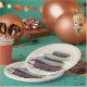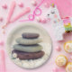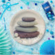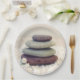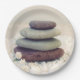 Teller aus Papier mit einem Foto mit Steinen übereinander. Umgeben von weißen Felsen und kleinen weißen Blume.