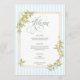 Elevate your place settings with this elegant lemon-themed wedding menu, designed to coordinate beautifully with your citrus-inspired suite. Featuring soft blue-and-white stripes, a delicate watercolor lemon-and-greenery border, and graceful script typography, this menu brings a fresh Mediterranean charm to each table while showcasing your meal in refined style. Perfect for coastal, garden, Italian-inspired, and summer weddings, it adds a polished, cohesive detail that enhances your reception décor from the first course to the last.