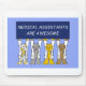 Vier Katzen mit weißen Mänteln und einem blauen Schild, auf dem steht: "Ärztliche Assistenten sind phantastisch".