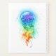 Grande méduse irisée, artistiquement dessinée, brillante, avec de longues tentacules sur le blanc, peinte sur l'arrière - plan multicolore. Méduse arc-en-ciel.