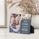 Nur die besten Mütter werden nach Meema befördert! Teilen Sie den Tag der Mutter mit dieser schönen Foto-Plakette, die ein wertvolles Foto ihres Enkels oder ihrer Enkel zeigt. Persönlich mit ihren Namen auf der rechten Seite, in weißer Schrift auf einem eleganten, blau-schieferfarbenen Hintergrund mit pfirsichfarbenen und rot-rosa Blume und grünem Blattwerk.