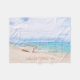 "Seas And Greeting" Sprichwort im Sandstrand. Fesselndes Fischerboot am Strand mit Aquarellblau und sonniger Himmel oben.
