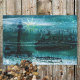 Die Sonne bricht durch Wolken, um auf einem Vintagen Schiff und Leuchtturm auf grünem Hintergrund schwach zu leuchten.