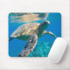 Unterwasseraufnahme einer Meeresschildkröte, die in kristallklarem Wasser direkt unter der Oberfläche schwimmt.