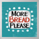 "Mehr Brot bitte" ist ein lustiges Textdesign mit weißer Akzent-Form, umgeben von weißen, weißlichen, weißlichen, weißgestrichenen Punkten.