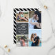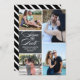 Dies ist eine wunderschöne Hochzeitskarte Save the Date mit vier Fotografien und weißem Text in Porträtgröße.