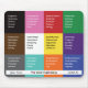 Ein personalisierbares Mauspad, das mit mehrfarbigen Kombinationen aus Schwarz, Rosa, Rot, Grün, Braun, Weiß, Gelb, lila, Grau, Zyan, Orange und Blau mit ihren jeweiligen Farbbedeutungen entworfen wurde. Ideal für Branding- und Grafikdesigner, Social-Media-Manager, die visuelle Content-Creative machen, oder alle, die eine einfache Art und Weise will, die Botschaft und Persönlichkeit ihrer Marke farblich zu vermitteln.
