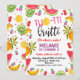 Die süße, farbenfrohe zweitii frutti Geburtstagseinladung für ein kleines Mädchen mit verschiedenen Früchten und einer dekorativen Schriftart-Kopfzeile. Diese niedliche Einladung ist sicher, die Szene für eine farbenfrohe Frucht themed zweiten Geburtstag Party Set.