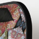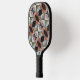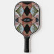 Ein Pickleball-Paddel mit bestickten, blumengeschmückten Kissen in einem Patchwork-Muster, eine lustige und schöne Illusion, die sowohl traditionell als auch boho chic ist. Tief, reich erdfarbene mehrfarbige Muster auf jeder Seite des Paddels in schönen Mustern mit schwarzem Akzent. Dieses Bild ist eine Originalfotografie von JLW_FOTOGRAFIE.
