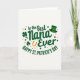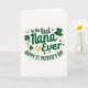 Cette carte de vœux présente un fond blanc brillant avec un grand message central qui se lit « à la meilleure Nana de tous les temps Joyeuse St Patrick », disposé en lignes empilées qui remplissent la majeure partie de la face avant. Les mots mélangent des lettres fluides épaisses avec des lettres de style imprimé plus simples, utilisant des verts émeraude profonds et feuillus pour que le message ressorte clairement. Près du mot « Meilleure », un chapeau de leprechaun vert avec une boucle dorée brillante penche comme s'il avait été posé là avec un petit clin d'œil affectueux 💚. Des touches chaudes d'or et d'orange apparaissent comme de petits accents, ajoutant une lueur chaleureuse autour du thème vert. Un fer à cheval doré se niche dans les courbes du mot « tous les temps », comme un porte-bonheur glissé près du message. Des trèfles à quatre feuilles dispersés dans des nuances de vert légèrement différentes