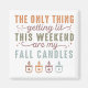Dieses humorvolle und gemütliche Herbstdesign besticht durch die witzige Phrase "Das Einzige, was dieses Wochenende zu spüren bekommt: Meine Herbstkerzen" in einer Mischung aus kühlen und eleganten Schriftart. Der Text ist kreativ mit unterschiedlichen Schriftart und Stilen angeordnet, was visuelles Interesse und einen spielerischen Ton schafft. Die Farbpalette umfasst warme Herbsttöne wie verbrannte Orange, erdige Grüntöne und weiche Braun, die die Wärme und den Komfort der Saison wecken.