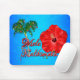 Mele Kalikimaka ist für frohe Weihnachten hawaiisch. Feiern Sie ein nettes warmes Strand Weihnachten. Mele Kalikimaka verziert mit Weihnachtsverzierungen und Zuckerstangen. Ein Weihnachten verzierte Palme und eine Feiertag rote Hibiskus-Blume.