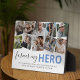 A modern memorial plaque featuring a photo collage of 10 family photos of you and your dad, the saying "forever my hero", and the quote "your presence we miss, your memory we treasure, loving you always, forgetting you never". This plaque makes a precious memorial keepsake for someone whos father has passed away, a special remembrance gift for father's day!