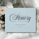 Customer specific, memorial, elegant, simpel "In Loving memory" handwriting font, light-blue, funeral guest book.