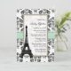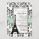 Invitations nuptiales de douche de joli et sophistiqué style parisien avec une frontière florale de damassé noire et blanche antique vintage, un vert en bon état et une conception de regard de ruban imprimée par jade et Tour Eiffel là-dessus. Conçu par Chrissy H. Studios, LLC. Tous droits réservés.