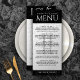 Ajoutez de la sophistication aux célébrations du 11e anniversaire des mariages d'acier avec ce menu du dîner, qui comprend du lettrage élégant sur plaque de diamant, de l'acier usé et des arrière - plans noirs. Customisez avec le nom du couple, la date du mariage, les détails du lieu, les menus et les messages de félicitations. Design © W.H. Sim. Voir plus sur zazzle.com/expressionsoccasions