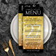 Ajoutez de la sophistication aux célébrations du 27e anniversaire du mariage musical avec ce menu du dîner, qui comprend des lettres élégantes et des confettis de notes musicales sur feuille d'or et arrière - plans noirs. Customisez avec le nom du couple, la date du mariage, les détails du lieu, les menus et les messages de félicitations. Design © W.H. Sim. Voir plus sur zazzle.com/expressionsoccasions