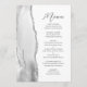 Cet élégant menu mariage moderne comprend une bordure en aquarelle gris et blanc, ornée d'une parties scintillant en faux argent. Le texte personnalisable combine le script d'écriture manuscrite gris charbon et les polices sans serif sur un arrière - plan blanc. La conception de l'agate est répétée à l'envers.