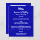 Un arrière - plan bleu royal. Texte blanc. Avant : Personnalisez et ajoutez votre nom, votre date et le menu. Retour : ajoutez votre propre photo et des faits amusants au sujet de la fille d'anniversaire. Supprimez les noms si cela n'est pas nécessaire. 1 feuille = 1 menu imprimé bord à bord.