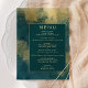 Cet élégant menu de mariage est doté d'un arrière - plan d'aquarelle abstrait moderne, bleu turquoise et or. Customisez le texte de couleur or dans des polices élégantes sur un rectangle turquoise foncé. L'arrière du menu reprend le design abstrait.