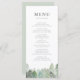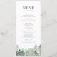 Cette carte de menu personnalisable comprend une forêt à feuillage persistant enneigée en aquarelle douce, ce qui en fait un endroit idéal pour les mariages d'hiver, les douches nuptiales ou les événements à thème rustique. Le design comprend des arbres à feuillage persistant avec de la neige tombante dans des tons verts et blancs apaisants. Il ajoute une touche boisée et saisonnière à votre table. Personnalisez-le avec votre nom d'événement, les détails du menu et tout autre texte dont vous avez besoin. Cette carte de menu aquarelle est une façon simple et élégante de cravate de votre thème ensemble.