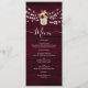 Vous apprécierez cette carte élégante de mariages en bois rustique, qui présente de riches fleurs d'aquarelle bordeaux dans des bocaux de mason, un monogramme personnalisé et des lampes à cordes éclatantes. L'arrière - plan chaleureux en bois et le script de calligraphie moderne créent un mélange parfait de charme rustique et d'élégance raffinée. Idéal pour les mariages d'automne, de grange ou de plein air, ce menu ajoute une touche personnalisée à votre réception et donne le ton pour une expérience culinaire inoubliable.