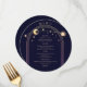 Mystical Rainbow Dark Navy Blue Sun Moon Stars Space Cosmic Astronomy Celestial Mariage Menu Cards dispose d'un cadre doré soleil, lune et étoiles sur un arrière - plan bleu marine foncé avec les détails de votre menu au centre dans le script moderne de calligraphie de pêche. Personnalisez en modifiant le texte dans les zones de texte fournies. Conçu pour vous par ©2024 Evco Studio à www.zazzle.com/store/evcostudio