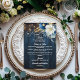 Un design de mariage élégant avec une calligraphie élégante complétée par un magnifique bois bleu, des lampes à cordes de jardin et un bleu blanc floral avec parties scintillant d'or. Vous pouvez personnaliser cela avec votre menu Mariage.