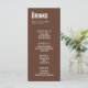 Présentez le Rustic Harmony Drinks Menu, un guide de bon goût conçu pour rehausser l'expérience de boisson à votre célébration mariage sur le thème rustique. Le menu en tête est composé d'un décor brun riche et chaleureux, créant une esthétique rustique et terreuse. Ce design se concentre sur la simplicité, sans fioritures, permettant au texte de prendre le devant de la scène. Comprenant une liste complète de choix, y compris des cocktails, des spiritueux, des vins et des bières, ce menu s'adapte à des préférences variées, assurant à vos invités un choix délicieux d'options parmi et améliorant leur plaisir global de votre journée spéciale. Le design élégant et pratique s'intègre harmonieusement à l'esthétique de la collection Rustic Harmony, créant une atmosphère cohésive qui reflète l'amour et la joie célébré le jour de votre mariage. A l'arrière du menu, l'arrière - plan brun clair est la toile parfaite pour un message personnalisé du couple. Cet espace attentionné vous invitation à transmettre de la gratitude, partager des sentiments, ou communiquer des détails spéciaux avec vos invités chéris, ajoutant une touche personnelle et intime à l'expérience de dîner. Le Rustic Harmony Drinks Menu, avec son design exquis, sa touche personnalisée et ses choix étendus, sert non seulement de guide fonctionnel, mais aussi de gardien chéri, résumant la beauté et l'amour célébré lors de votre journée mémorable d'une manière rustique et sobre.