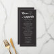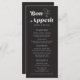 Ces menus de diner mariage de style vintage de 4" x 9" présentent des lettres blanches avec un titre stylisé, "Bon Appetit", en grandes lettres blanches avec un accent de coeur sur un arrière - plan noir. Le menu propose 2 entrées, 2 entrées et 2 desserts ainsi que les noms des couples mariages. Couleurs hexadécimales, blanc-fbfbfb et noir-231f20.