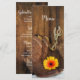 Customisez le menu rustique Cowboy Boots, Daisy and Horse Bit Mariage campagnard Menu avec les détails du repas que vous pourrez servir à votre soirée de fiançailles décontractée mais classe, douche nuptiale ou réception de mariage en ajoutant la salade ou le premier plat, entrée ou deuxième plat et dessert ou troisième plat. Ce menu informel à thème équin personnalisé mariage propose une photographie florale pittoresque d'une paire de bottes de cow-boy occidentales en cuir, fleur de marguerite jaune et orange, collier de perles blanches, poitrine de cheval et robes en cuir avec un arrière - plan de grange patiné marron.
