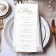 Le menu simple mariage or et blanc présente une calligraphie tourbillonnant élégante et romantique avec un script formel. Pour une personnalisation plus avancée de cette conception, cliquez sur le BOUTON OUTIL DESIGN BLEU ci-dessus !