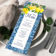 Carte de menu élégante et moderne blanche et bleue. Le design présente une paire de citrons avec des tiges feuillues et un fond de carrelage méditerranéen. Personnalisez-le facilement avec les détails de votre mariage.